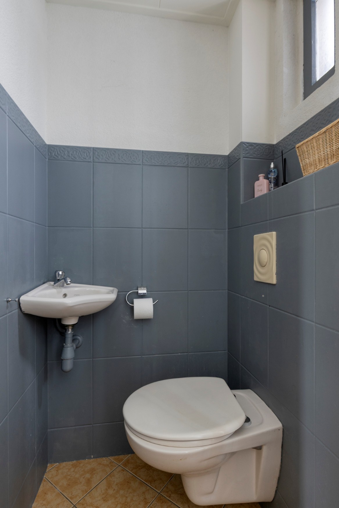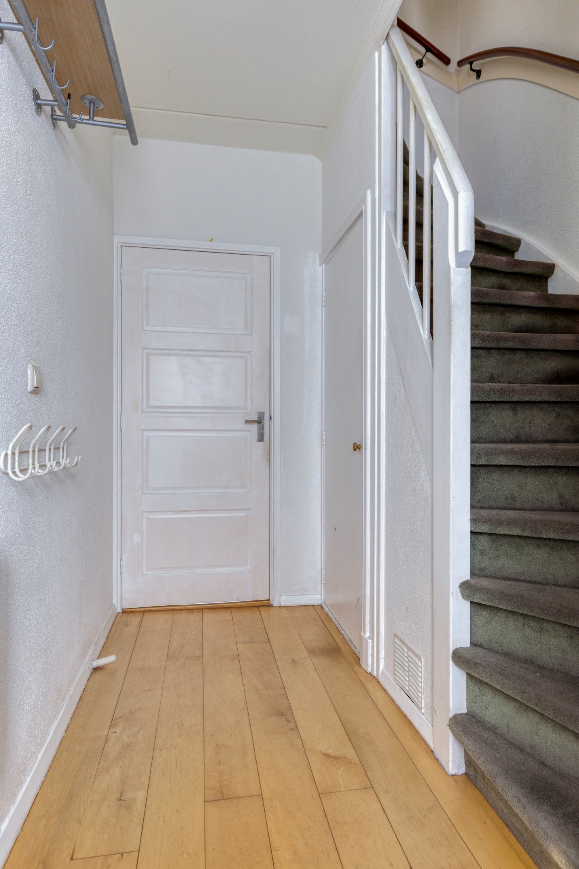 Entree aan de voorzijde. Hier is het toilet en de trapopgang, alsmede de doorgang naar de keuken.