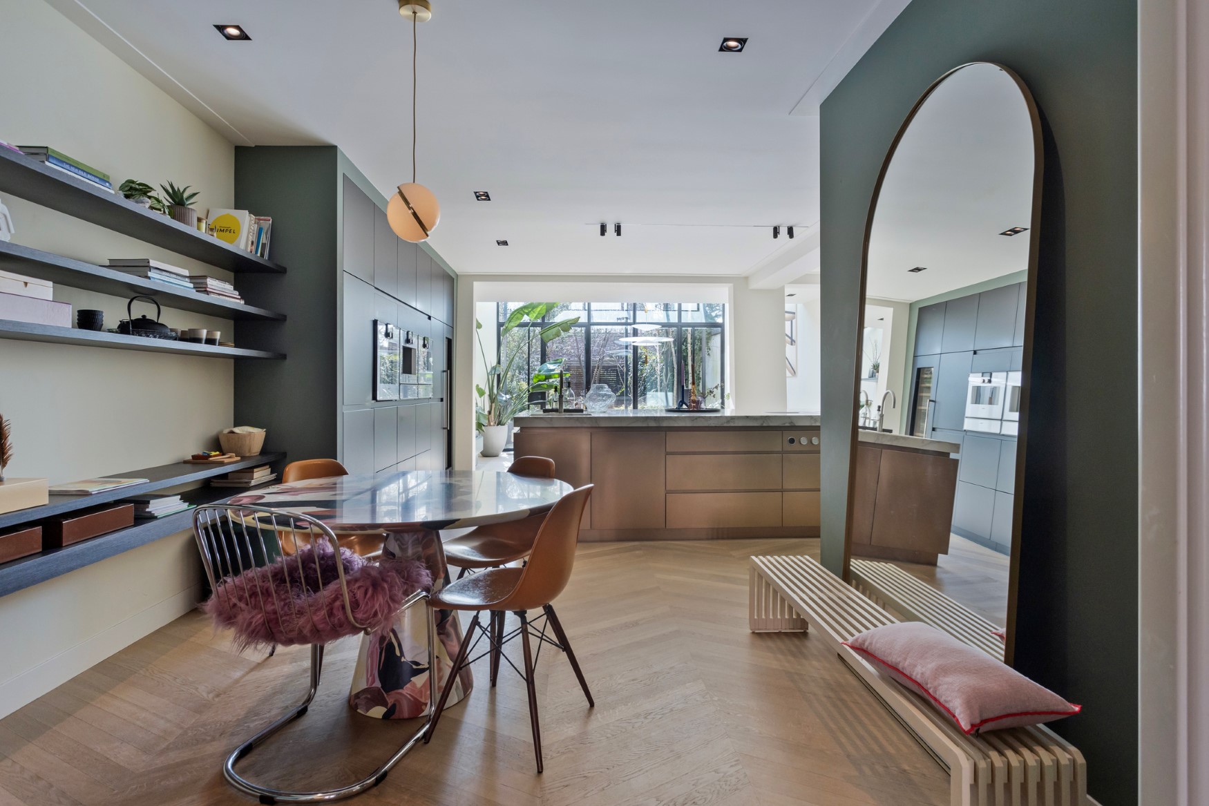 A wonderful place to come home to and discuss the day, or to enjoy a glass of wine with friends. There is space for a large dining table at the rear of the house. The lovely conservatory forms a beautiful whole with the house and the large windows provide plenty of light and a wonderful connection to the lovely green garden. Open the double French doors and bring the outside in.