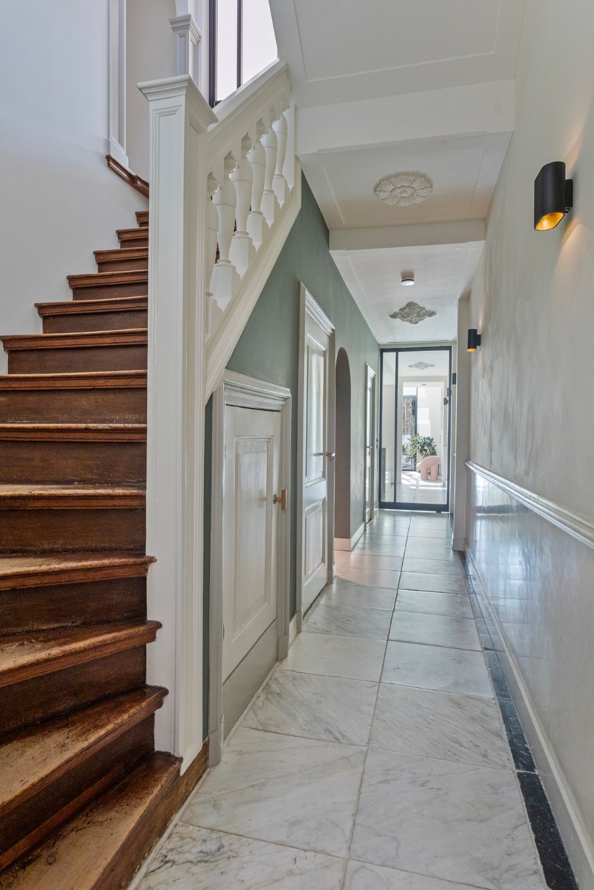 You can proudly welcome your visitors, friends, family and business associates here. The entrance with its impressive framed front door, featuring Rococo wood carvings, makes a great first impression and sets the bar high for the rest of the house. But you won’t be disappointed. A spacious entrance hall with high ceilings connects several rooms on the ground floor.