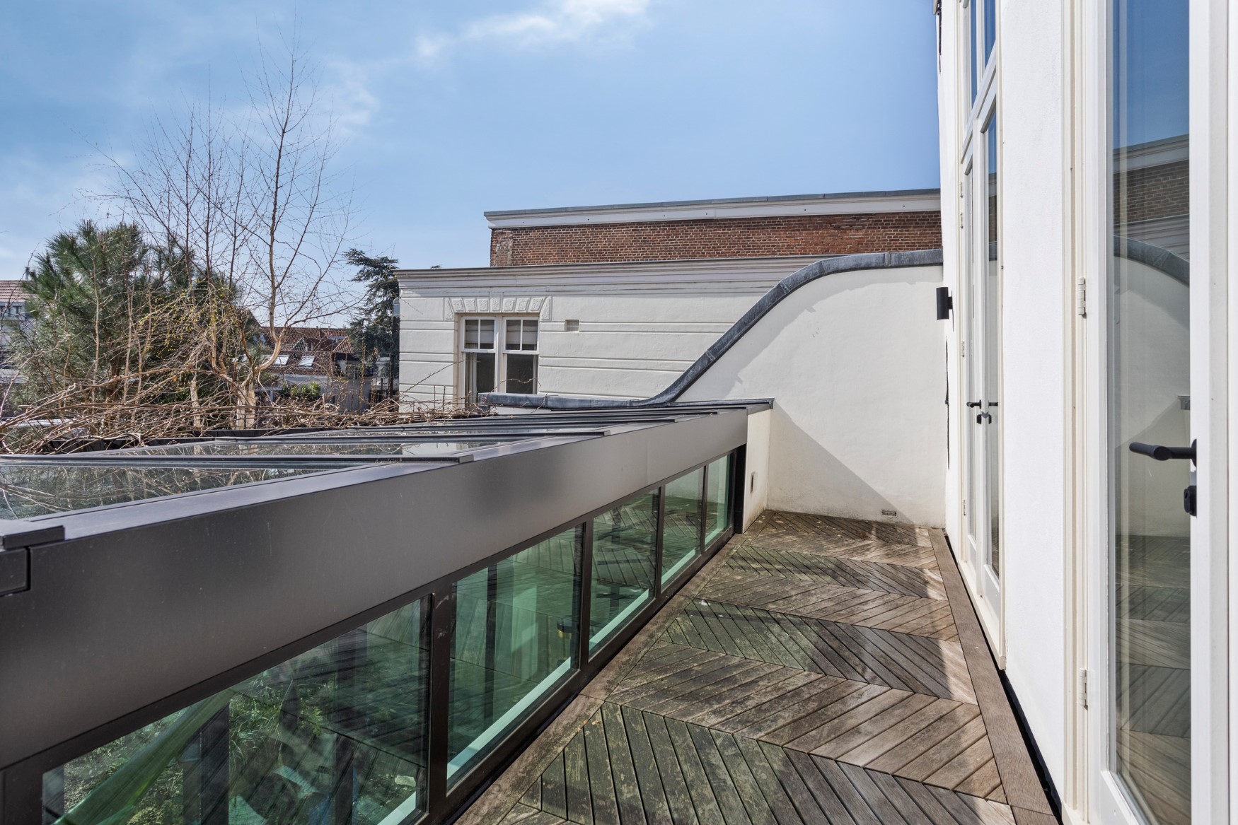 On the first floor, you will find a second living room with a pantry. It is actually a showroom. A spacious room with a marble fireplace and wood-burning stove, high windows, a beautiful ceiling and a custom-made wall unit, where the TV and sound system are fully integrated. We imagine you spending quality time here with your family, celebrating Christmas or inviting your most important relations for a good conversation. In between, you can get some fresh air on the adjoining roof terrace.