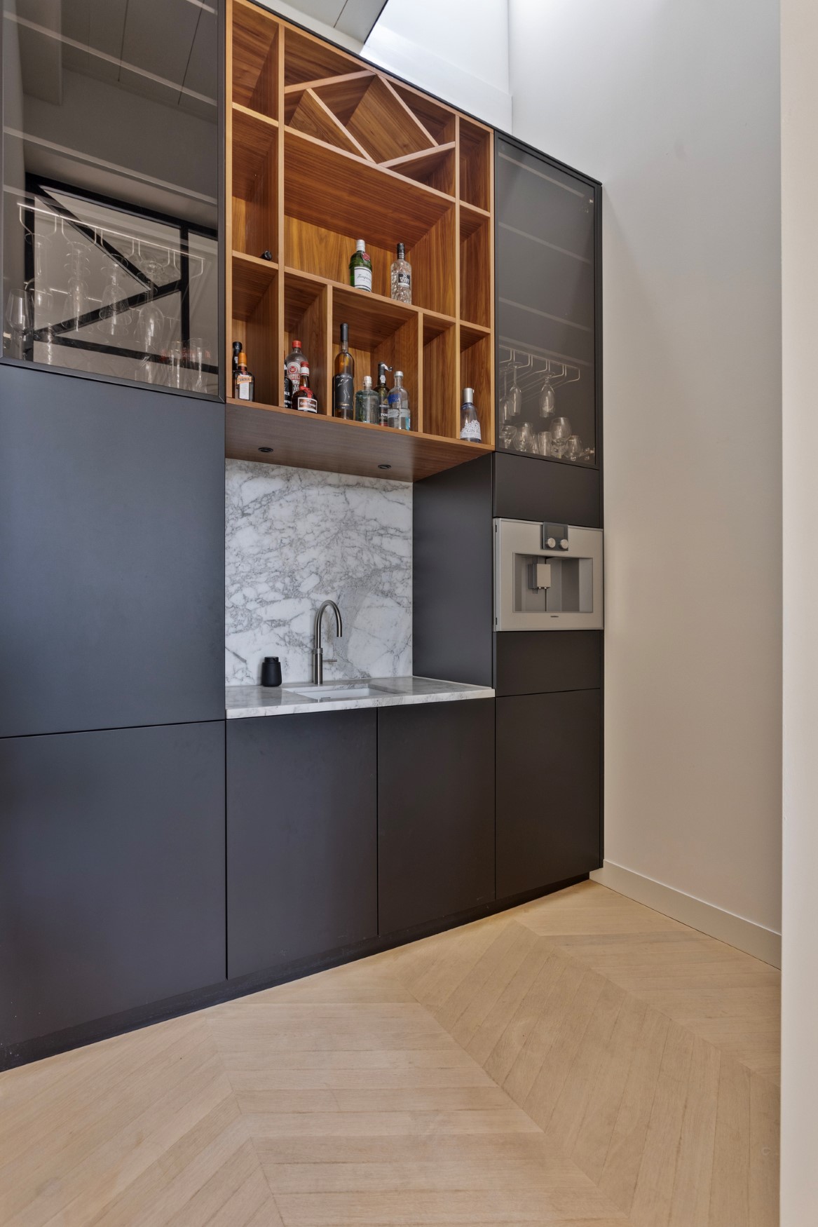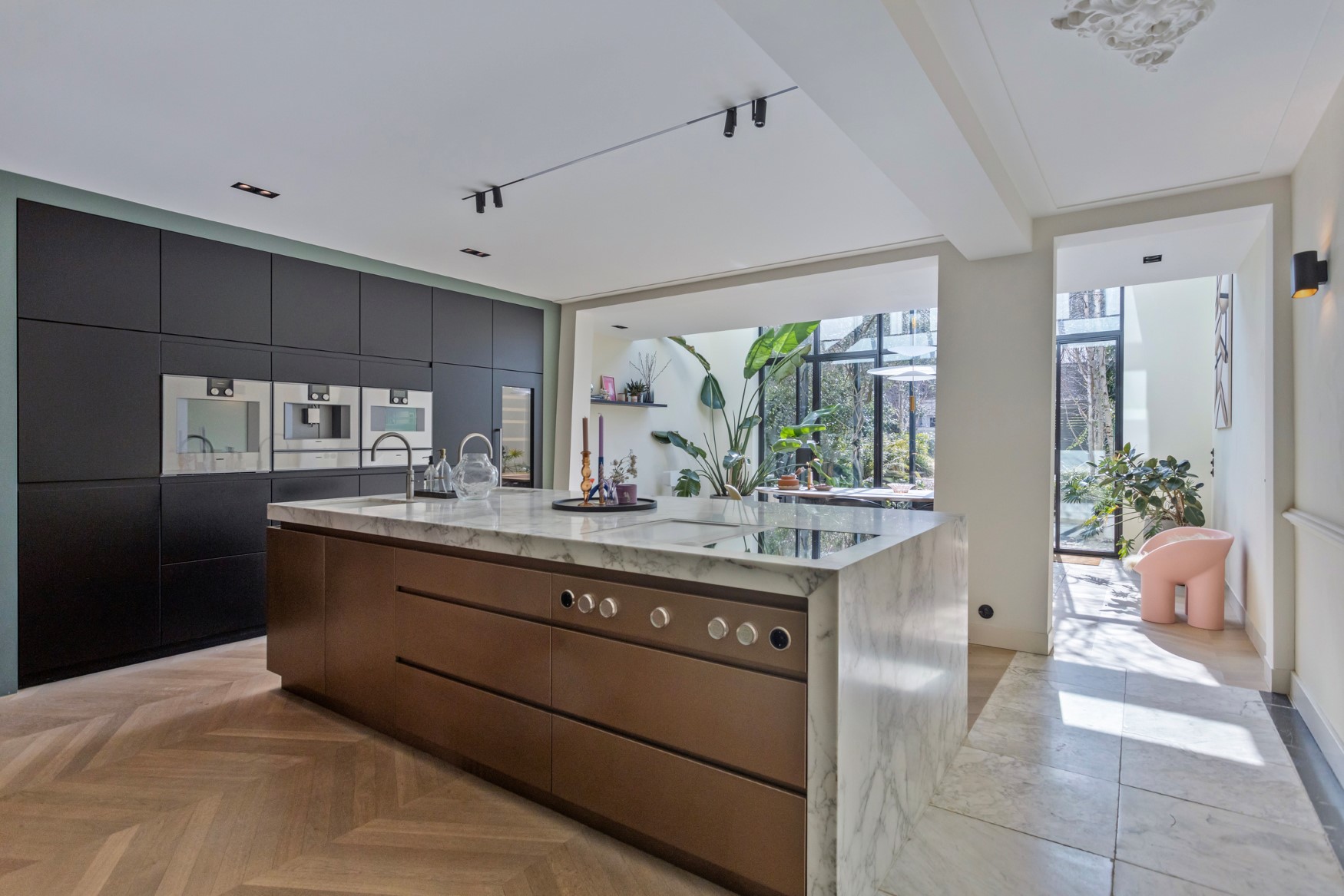 At the front, we find the front room with a beautiful large fireplace and high windows with en suite doors. There you will find a connecting room, the TV room. It is also an ideal place to relax with a cup of coffee at the dining table, to work, or for the children to play games or do their homework. This space then connects to the heart of the home, the fantastic kitchen. A beautiful island with a marble top made from a single piece! Two sinks and two Quookers. You will also find a custom-made, attractive wall unit with plenty of storage space and exclusive Gaggenau appliances. The fridge-freezer and, of course, a wine cooler are not missing.