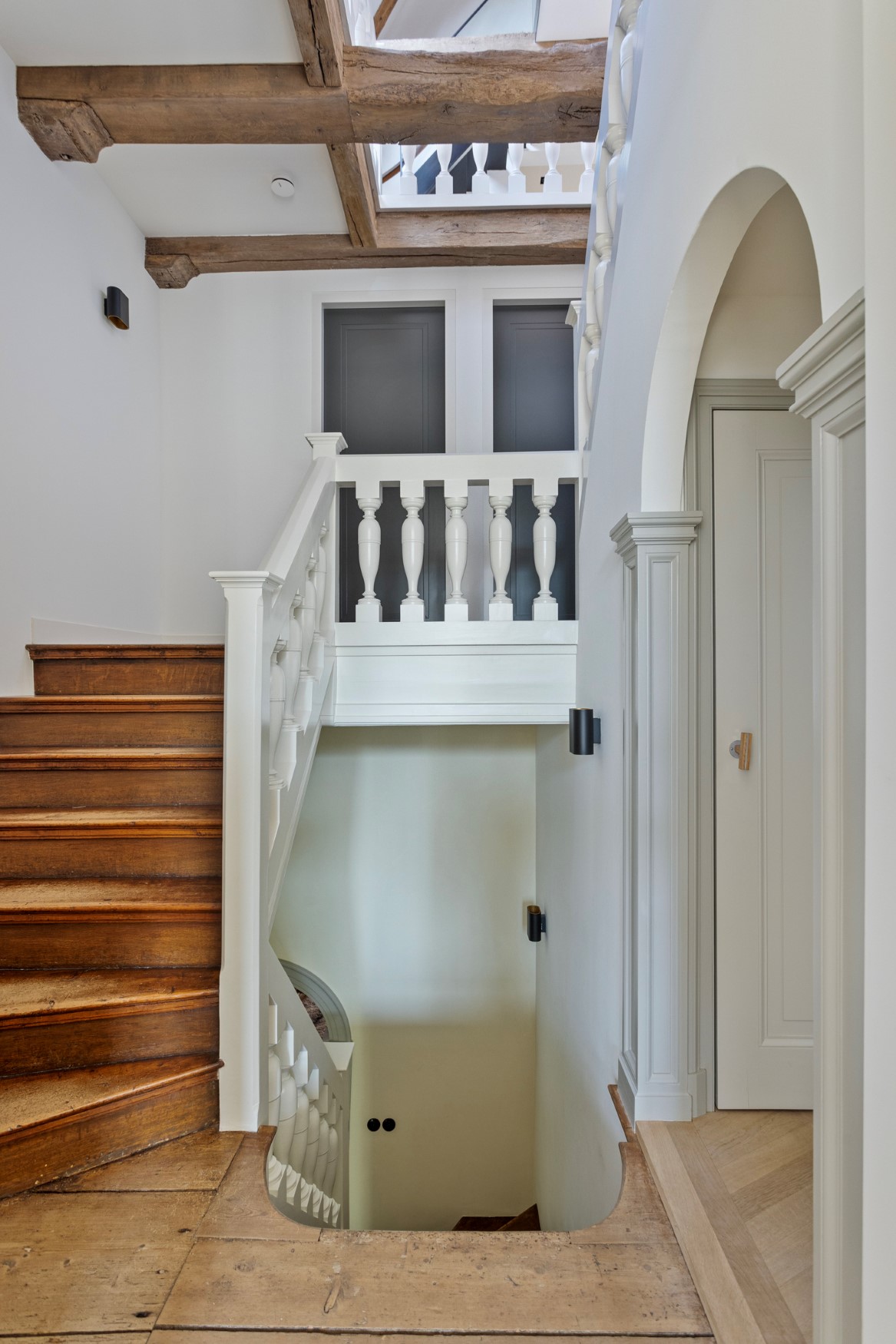 We go up the stairs, but pause for a moment. Take a look at the beautiful old steps and the heavy staircase banisters and handrails. Beautifully finished all the way to the top floor.
