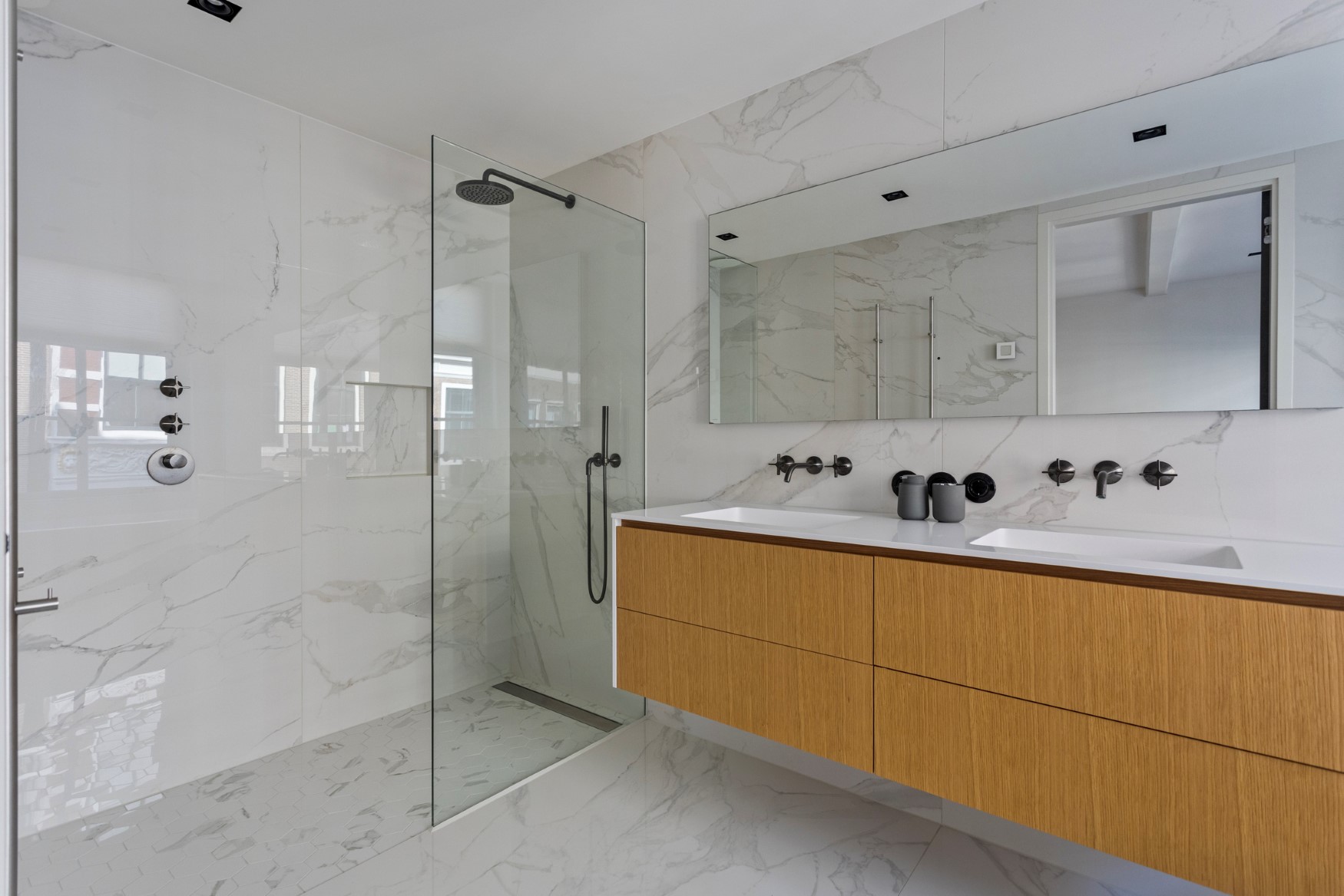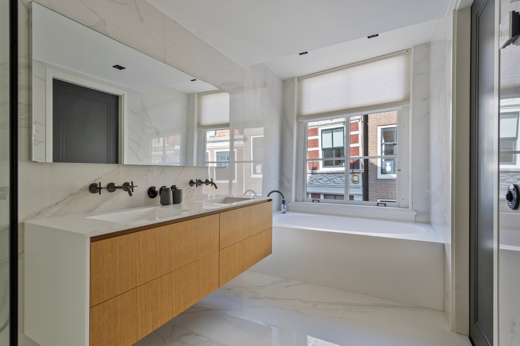 On the second floor, you will find a marble toilet and a bedroom at the front with a beautiful view of the Grote Oost. Adjacent to this is a bathroom with a large bathtub, double sink and walk-in shower. All taps are neatly integrated into the wall. There is also a separate laundry room with built-in furniture, so you can use the machines at a comfortable height.