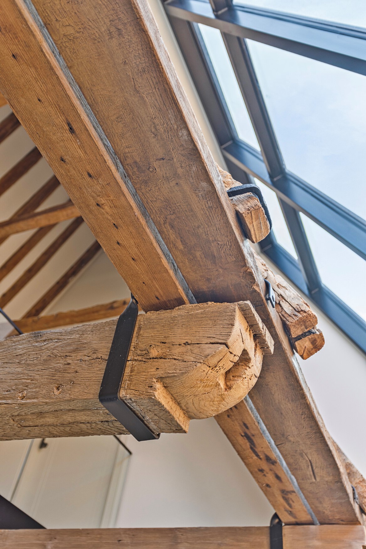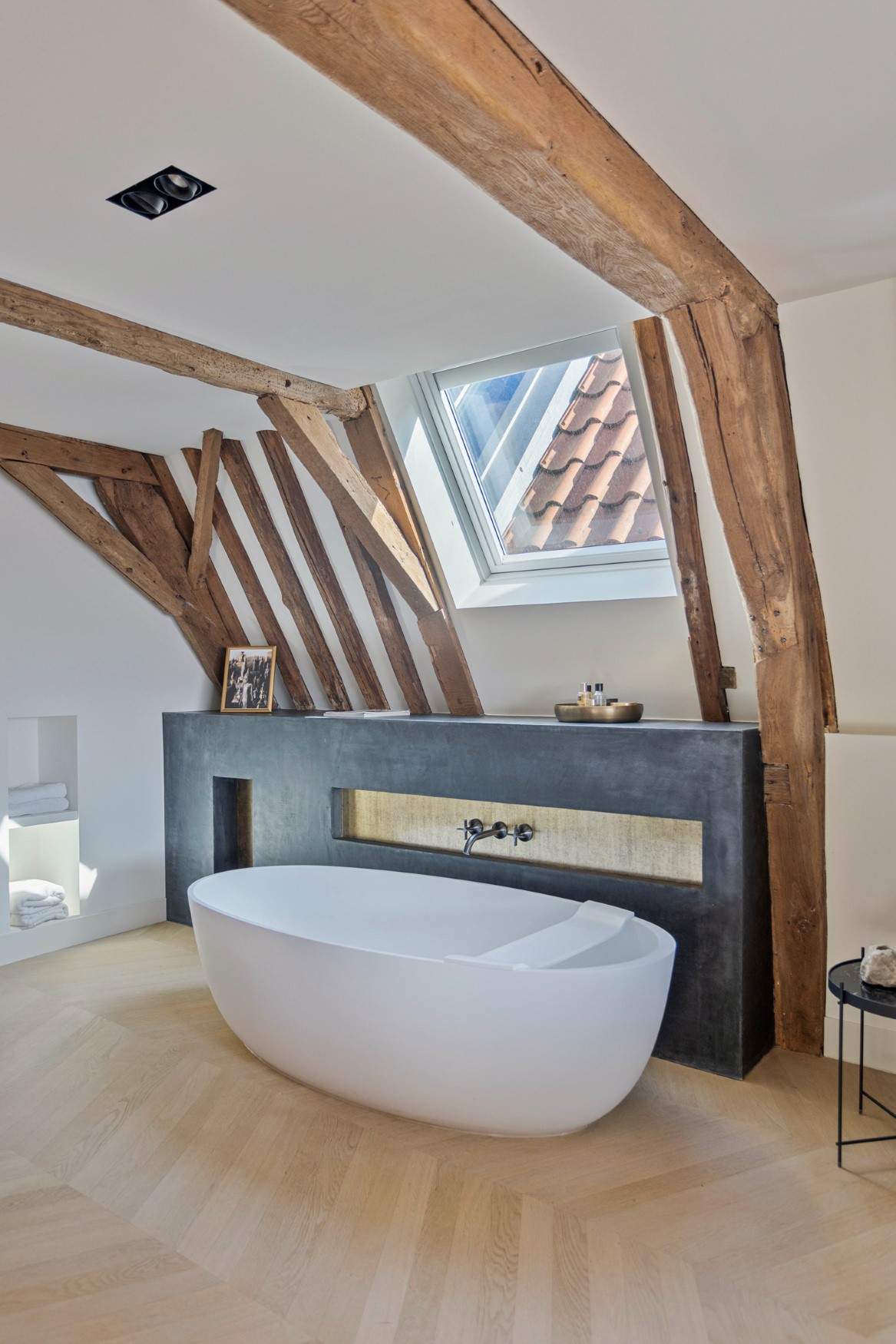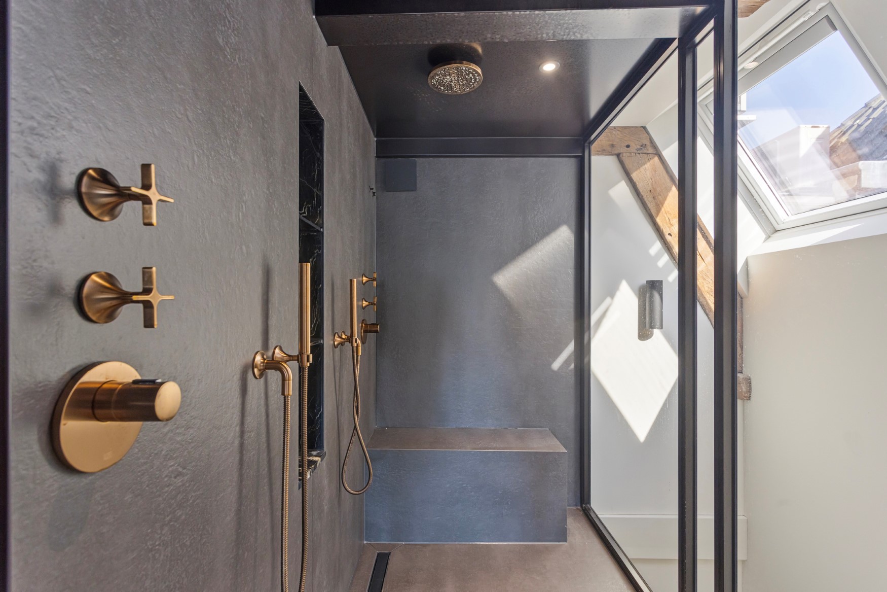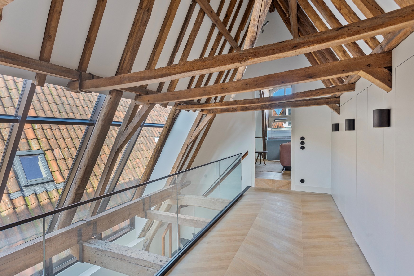 We proceed to the third floor. Here, part of the roof has been tastefully opened up and fitted with glass. Beautiful light enters the space, and the beams and rafters have been attractively incorporated into the design. The large landing connects two bedrooms at the front, one of which has a side window offering a view of the entire street. Adjacent to this is another bathroom with a walk-in shower and wall-mounted toilet.